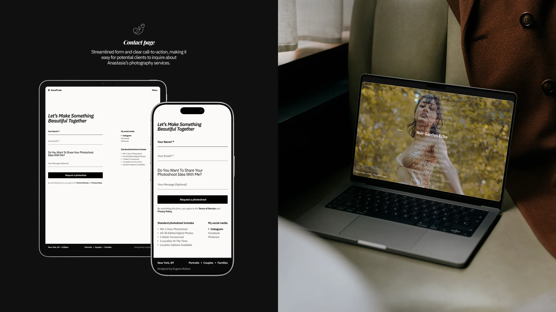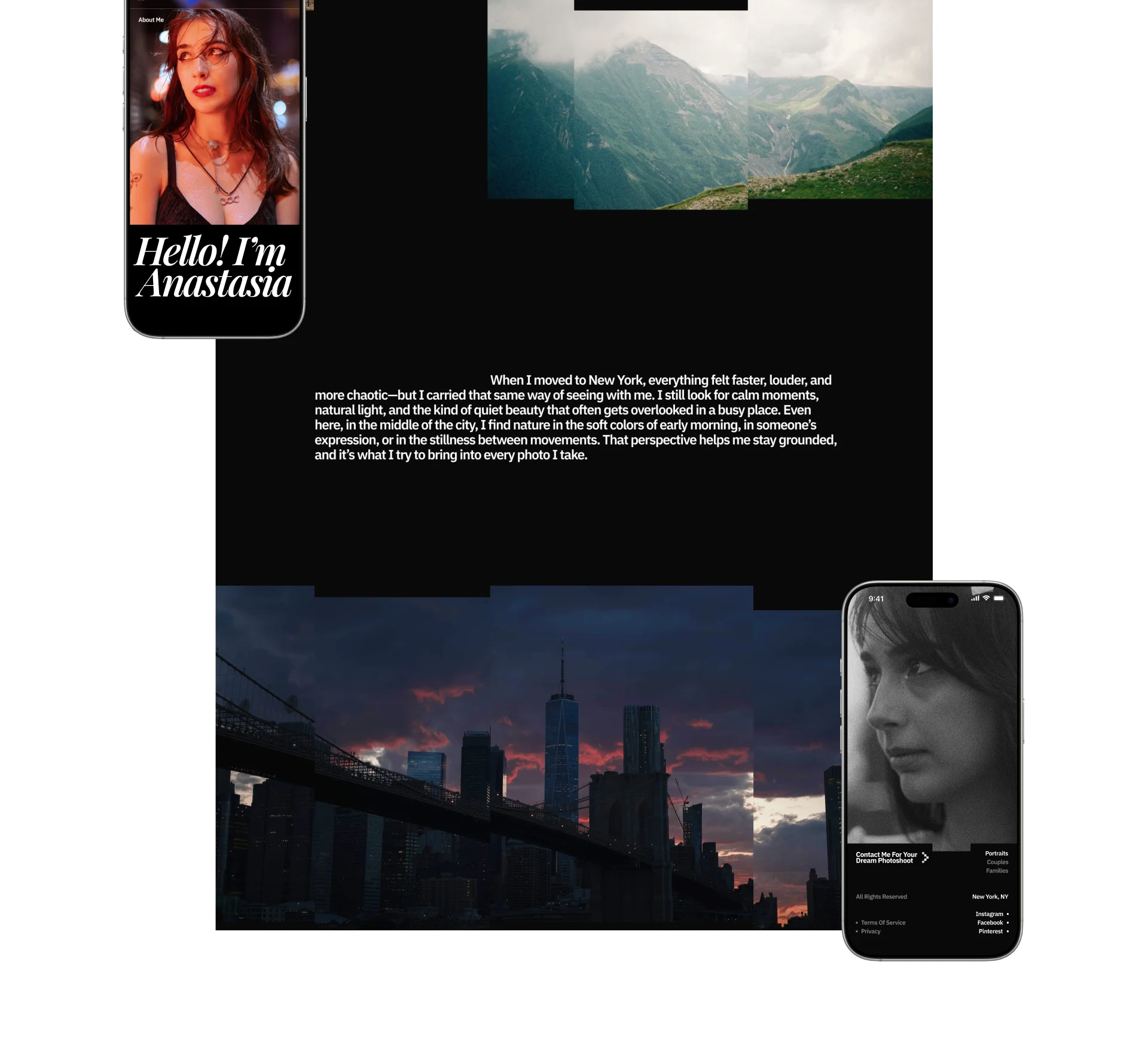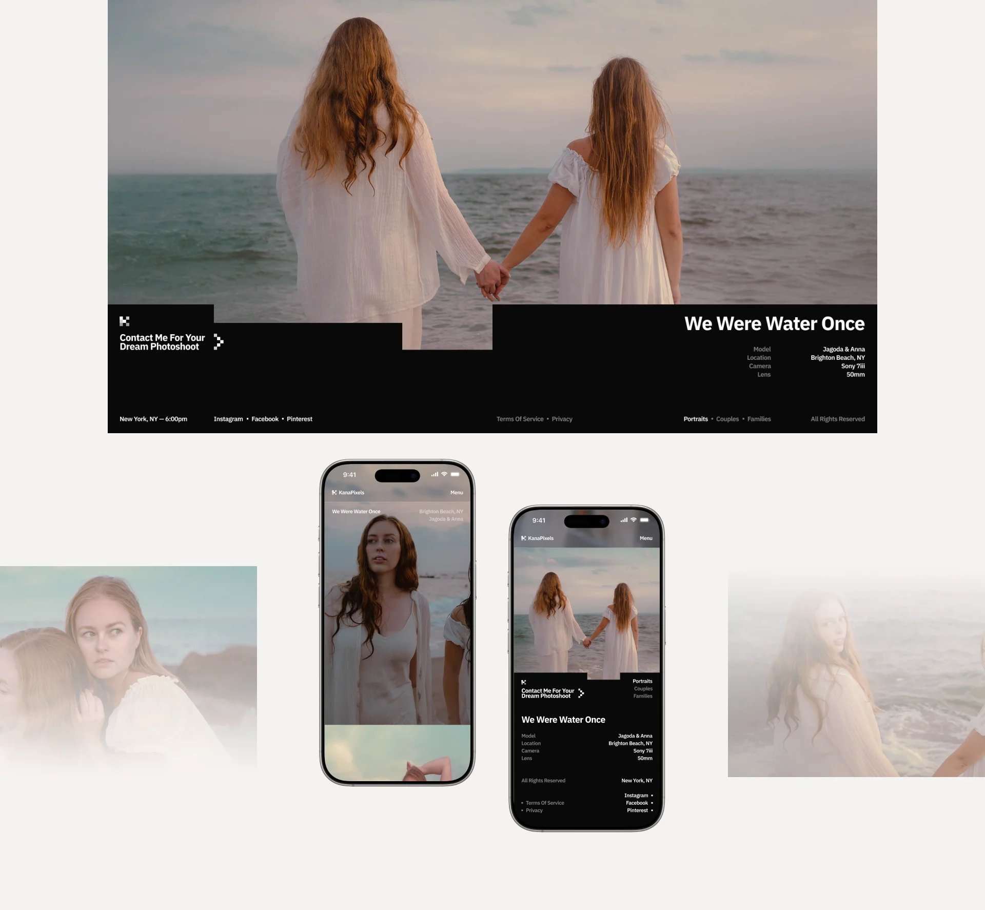 Facing the challenge of creating a portfolio website for photographer Kana that could be easily updated with new content while maintaining a timeless aesthetic to match the enduring quality of her photographs. By designing a clean, minimalist interface with modular galleries and intuitive backend tools, the site allows seamless content renewal without compromising its elegant, evergreen design, ensuring Kana's work remains the focal point for years to come.